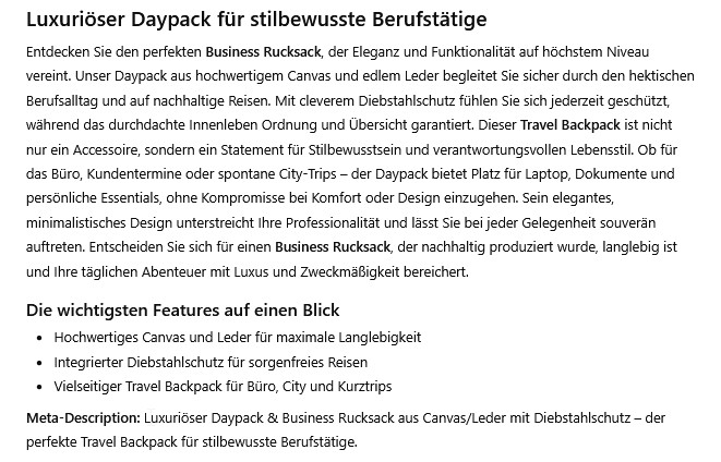 Die Lösung: Dieses Template verwandelt Ihre Rohdaten in eine emotionale, verkaufsstarke Produktbeschreibung – inklusive präziser Zeichenlimits für Titel und Meta-Descriptions, optimiert für maximale Conversion. Erschaffen Sie Premium Produkte, keine Massenware!