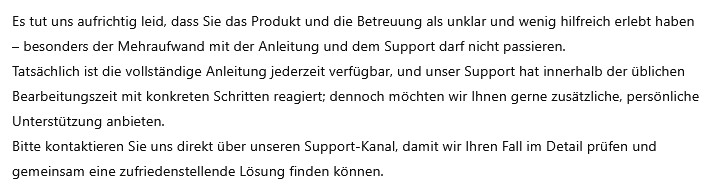 Die Lösung: Das Template generiert eine Antwort, die exakt einem dreiteiligen, deeskalierenden PR-Plan folgt (Empathie, Fakten, Offline-CTA). Die KI wandelt emotionale Kritik in eine professionelle, lösungsorientierte Markenbotschaft um.